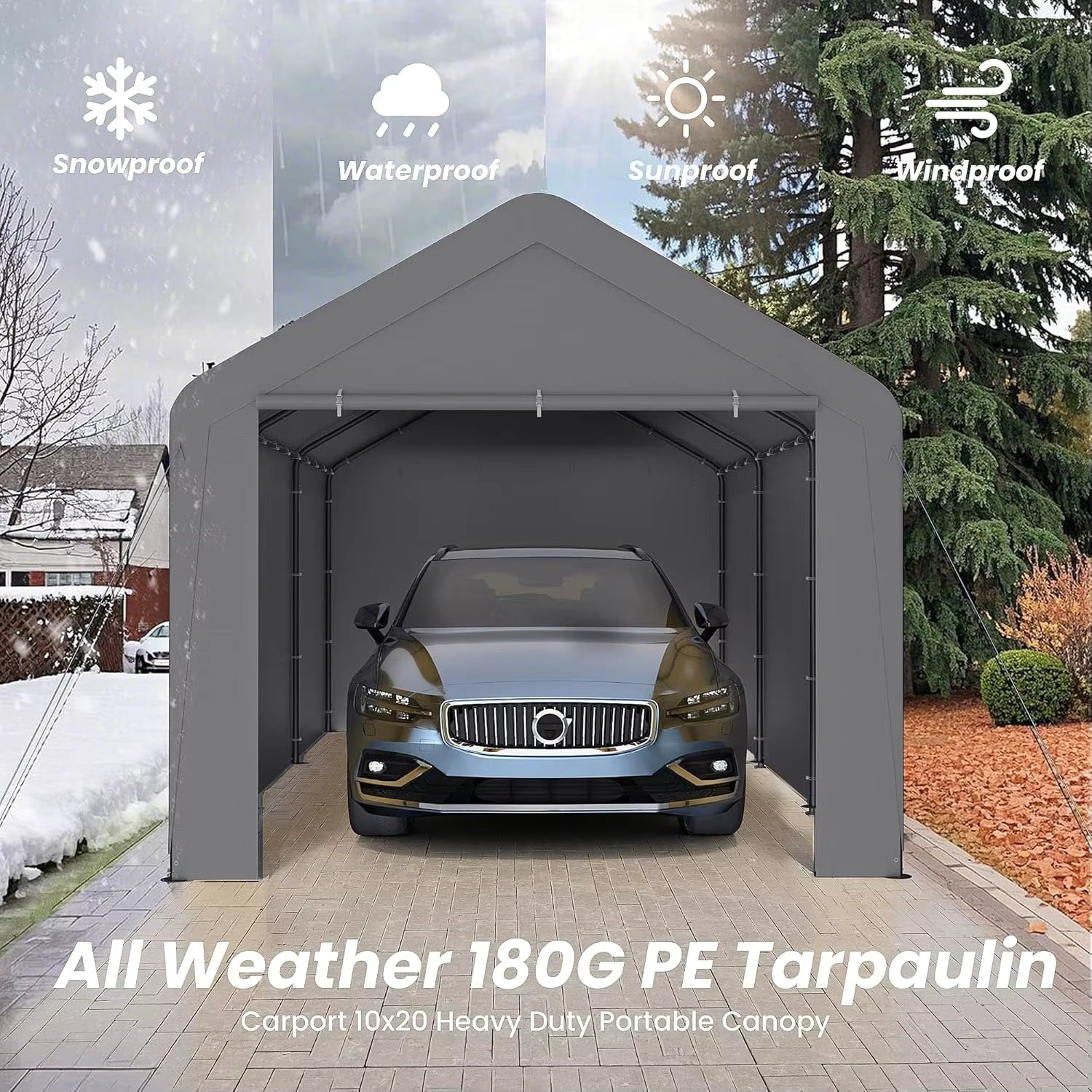 Car canopy 10x20 Heavy-Duty all weather is made of 180G Polyethylene material, providing a Safe Space for cars/lawn mowers/cargoes.The car shed is resistant to harsh weather conditions such as rain, Snow & High winds, keeping your Car in top condition at all times.